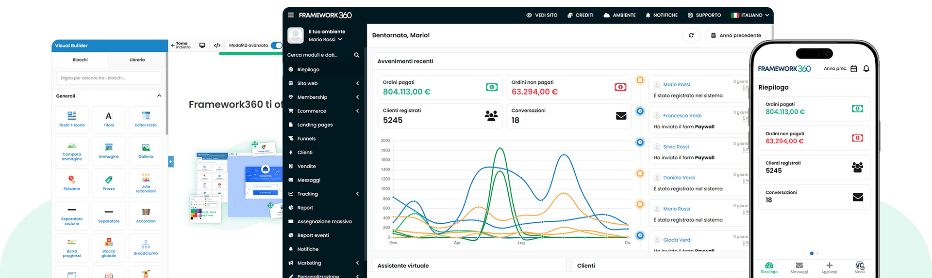 In realtà, Framework360 è una piattaforma cloud completamente gestita che riunisce in un unico ambiente tutto ciò che, di solito, viene sparso in tanti strumenti diversi: creazione del sito, CRM, marketing automation, e-commerce, comunicazione multicanale e gestione operativa.